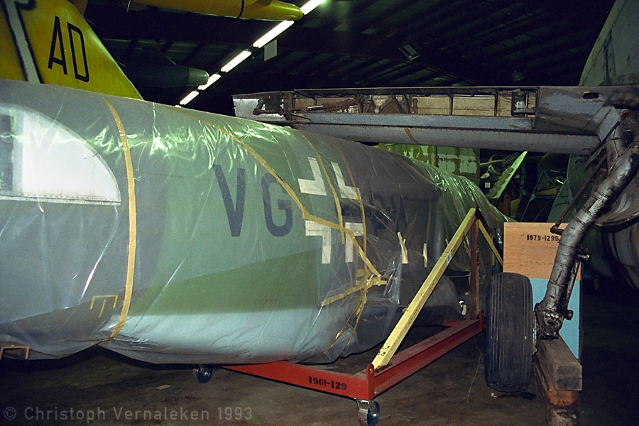 Alle Teile waren 1993 noch so verpackt, wie sie 1989 aus Deutschland zurückgekommen waren. Entgegen anderslautender, in "informierten" Kreisen kursierender Gerüchte war die Maschine jedoch nicht auf einem Abenteuerspielplatz gelandet, wie diese Bilder eindeutig beweisen. Im Bild oben sieht man das Leitwerk mit der Werknummer und die Höhenflossen.